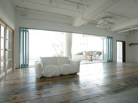 南全面に広がる海を背景に、1Fは全開する幅8mの扉を開くと屋外テラスと一体化するプロバンス風のキッチン付きフロア。2Fは白・ベージュ基調のベッドルーム付き南欧ホテル風スペース。いずれも多彩な小道具で演出されている。